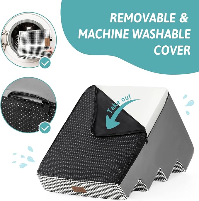 - Non-Slip Base and Removable Cover: Our dog steps for beds are equipped with a non-slip base featuring rubber dots for extra grip, minimizing movement during use. The pet steps cover is waterproof inner side, so you donβt have to worry about stains seeping into the foam. The outer cover is removable and machine washable for easy cleaning