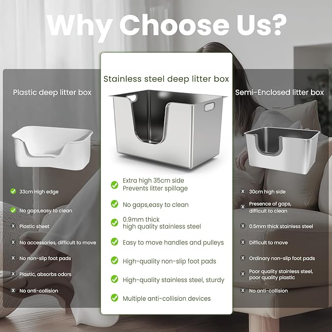 - Odor-Free & Easy to Clean: Crafted from high-quality stainless steel, this open cat litter box won't absorb odors. Durable metal material resists dents, scratches, and abrasions, ensuring long life and easy cleaning. Unlike plastic trays, a stainless litter box is rust-proof and non-stick, helping to maintain a fresh, sanitary environment for you and your pet.