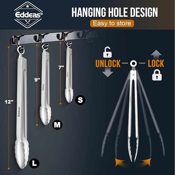 - FOOD-GRADE STAINLESS STEEL - EDDEAS kitchen tongs are made of 1mm thick food-grade stainless steel in one piece for enhanced robustness and heat resistance, rust resistance and easy handling. Tongs for cooking the overall light weight and ergonomic features are maintained.