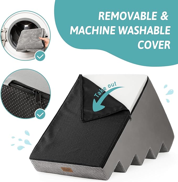 - Non-Slip Base and Removable Cover: Our dog steps for beds are equipped with a non-slip base featuring rubber dots for additional grip, minimizing movement during use. The pet steps cover is waterproof on the inner side, so you donβt have to worry about stains seeping into the foam. The outer cover is removable and machine washable for easy cleaning