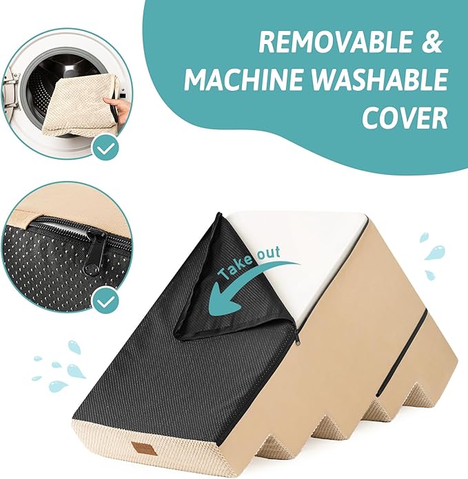 - Non-Slip Base and Removable Cover: Our dog steps for beds are equipped with a non-slip base featuring rubber dots for extra grip, minimizing movement during use. The pet steps cover is waterproof on the inner side, so you donβt have to worry about stains seeping into the foam. The outer cover is removable and machine washable for easy cleaning