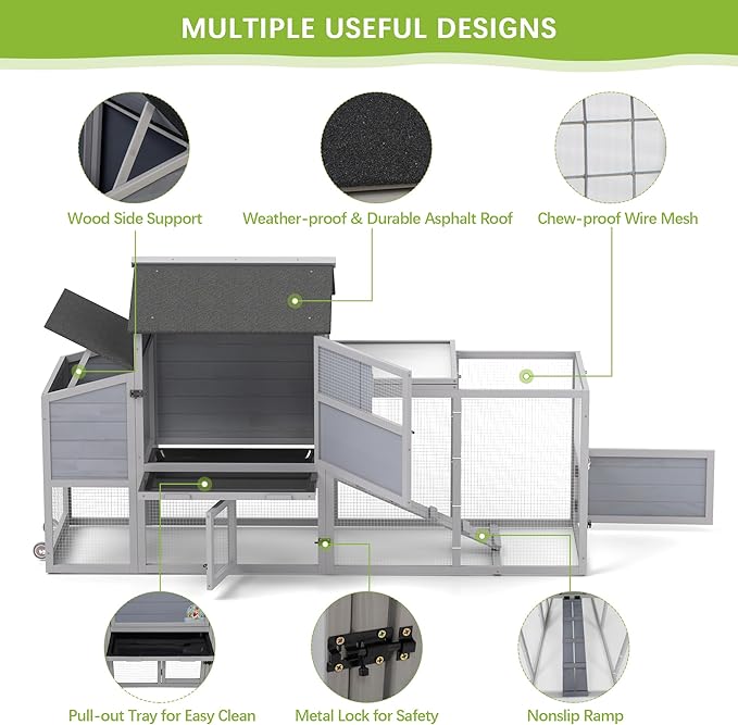 - 【Chicken Coop with Ample Space】: Measuring 82.29 inches in total length, this chicken coop provides chickens with a spacious living area and run area on the ride side for free roaming and exercise freely, suitable for 2 adult chickens or other similar sized pets.