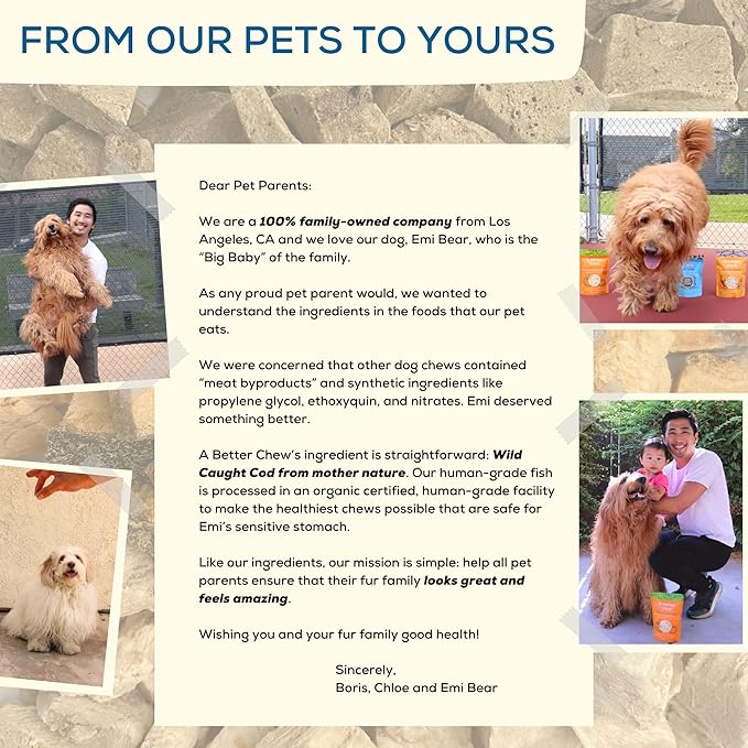 - SUSTAINABLY SOURCED AND MADE IN THE USA: Our chews are sustainably sourced, wild caught and human grade. Our mission is to ensure only the freshest, healthiest, and best quality ingredients to make A BETTER CHEW - from the makers of A BETTER TREAT.