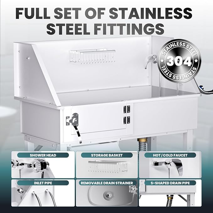 - The DYTREND dog washing station features a stainless steel surface coated with a white powder finish, offering enhanced protection against scratches and ensuring the inner steel stays intact. This finish not only improves durability but also provides a sleek, modern look that seamlessly complements various furniture styles