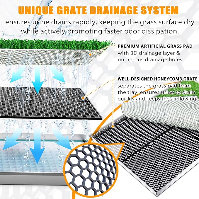 - 【Upgrade Grid Design】 The heavy-duty plastic grate layer lifts artificial turf above the pee pad, directing urine straight through evenly spaced holes. No puddling or turf soaking! Can maintain dryness and comfort around the clock.