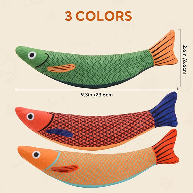 - [Unique Fish Design] These 3 catnip fish toys are designed into 3 bright colors which conforms to the catsโ preference. Each fish measured 9.3*2.6 inch(23.6*6.6cm) size which is perfect for indoor cats kicking. Crinkle paper and catnip inside can entertain your feline friends.