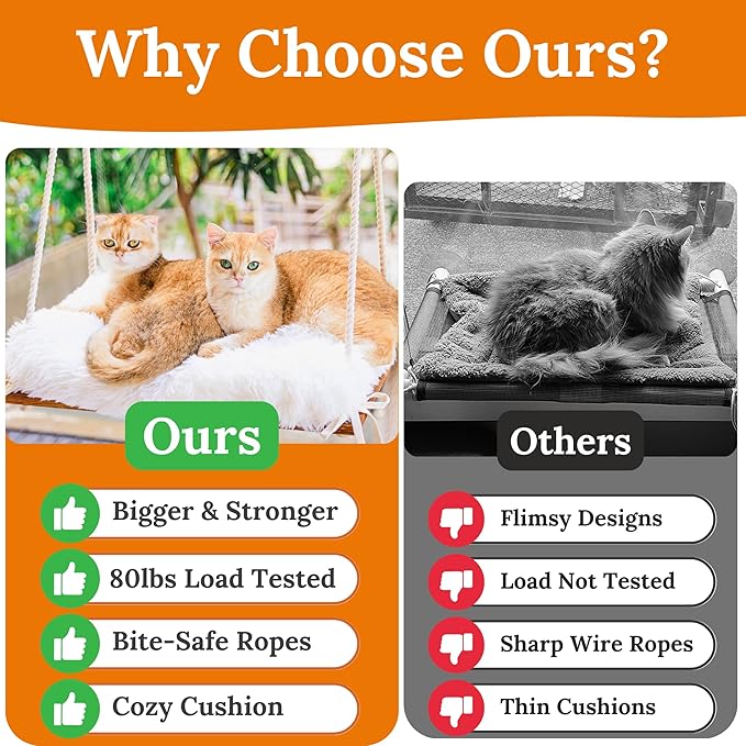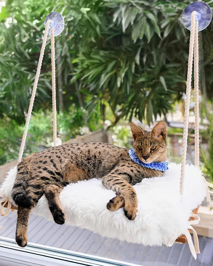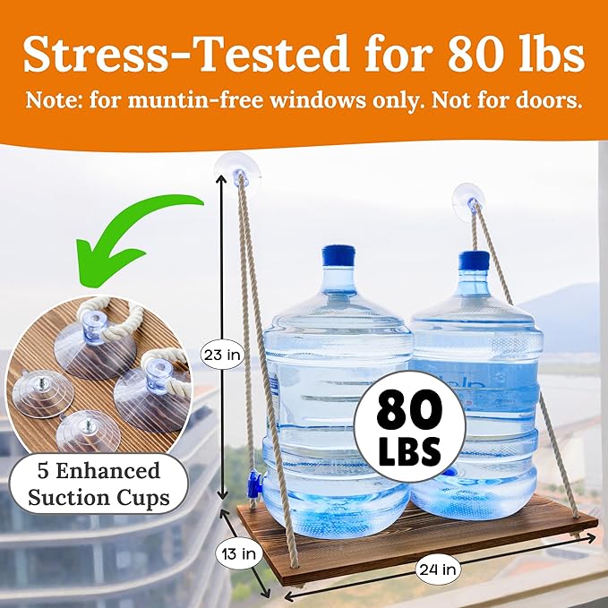 - Strong & Sturdy Frame: Built with a solid pine wood board and thick cotton ropes, and enhanced with 5 strong suction cups capable of supporting up to 80 lbs, our cat window seat guarantees durability and a security while your feline friend enjoys the view.