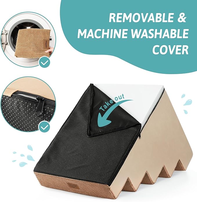 - Non-Slip Base and Removable Cover: Our dog steps for beds are equipped with a non-slip base featuring rubber dots for additional grip, minimizing movement during use. The pet steps cover is waterproof on the inner side, so you donβt have to worry about stains seeping into the foam. The outer cover is removable and machine washable for easy cleaning