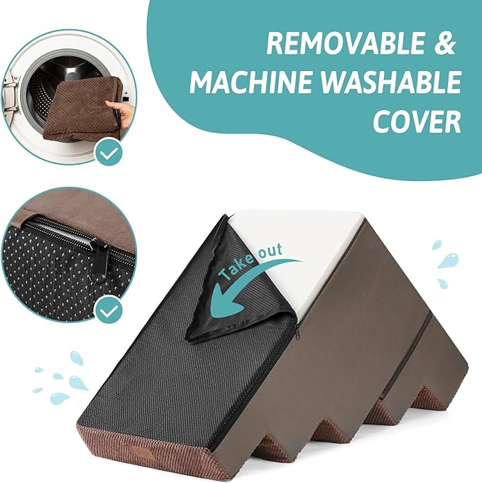 - Non-Slip Base and Removable Cover: Our dog steps for beds are equipped with a non-slip base featuring rubber dots for extra grip, minimizing movement during use. The pet steps cover is waterproof on the inner side, so you donβt have to worry about stains seeping into the foam. The outer cover is removable and machine washable for easy cleaning