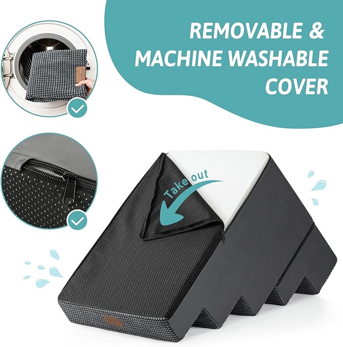 - Non-Slip Base and Removable Cover: Our dog steps for beds are equipped with a non-slip base featuring rubber dots for extra grip, minimizing movement during use. The pet steps cover is waterproof on the inner side, so you donβt have to worry about stains seeping into the foam. The outer cover is removable and machine washable for easy cleaning