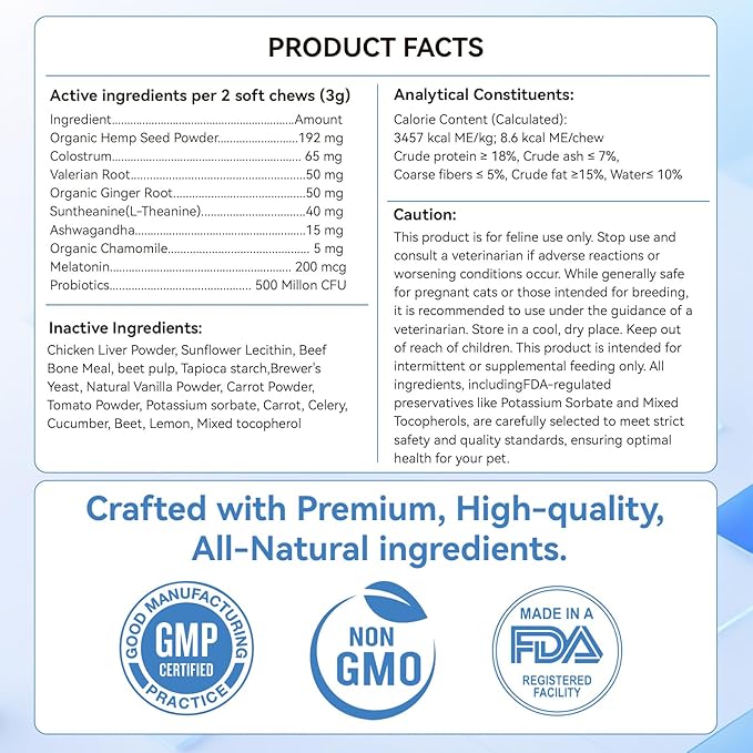 - Natural and Healthy Ingredients: Crafted with natural ingredients like organic hemp seed powder, L-Tryptophan, valerian root, chamomile, colostrum, and melatonin, our calming treats for cats are scientifically formulated to ease tension and improve sleep quality. Free from artificial additives, grains, or sugar, they provide safe and reliable support for your catβs health.