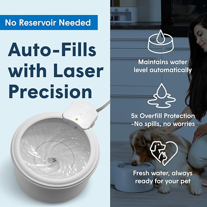 - Smart Laser Technology for Automatic Refills: The Always Full Pet Water Bowl uses precision laser technology to monitor water levels, ensuring your furry friend always has fresh, clean water; When the water level drops by 10mm, the bowl automatically refills—plus, its self-flushing system removes debris every hour, keeping water free from hair, food particles, and mess, no drain required; Spend less time filling and cleaning cat & dog bowls and more time enjoying moments with your pet