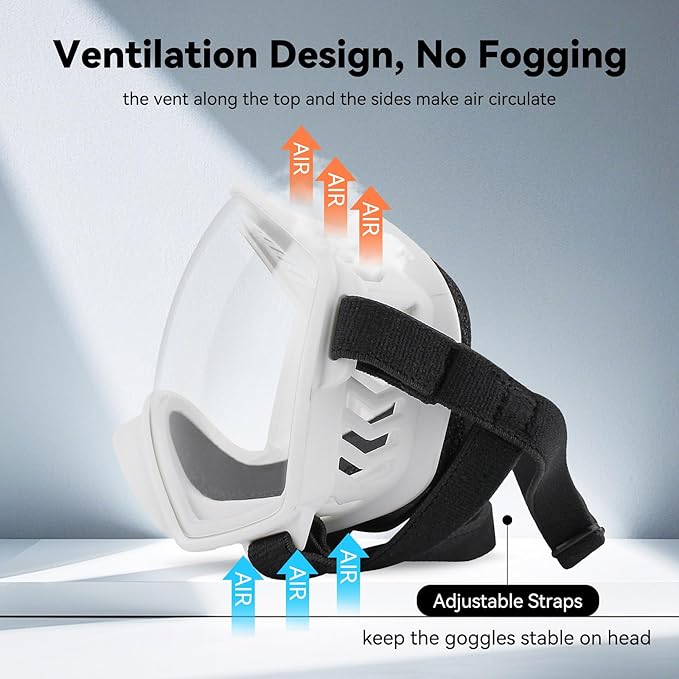 - Adjustable nylon strap allows you to adjust dog goggles according to the size of the dog without giving the dog a sense of restraint. Compared to other dog sunglasses, our products are designed with larger and more ventilation holes, it can better reduce the generation of steam and fog, offering further protect the safety of the dog