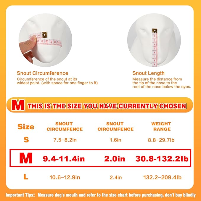 - 【Size Option: M (Circumference: 9.4''-11.4'' in)】Size M is suitable for medium sized dogs, such as Husky and Springer Spaniel, etc. Please make sure to measure the dog's snout before purchase and refer to the size chart to choose the right size. If you have any questions about product quality or size, please feel free to contact us.