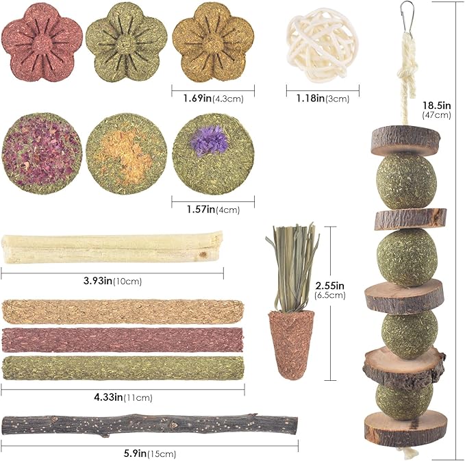 - Chewing & Treats & Toys: rabbit chew toys in a variety of shapes,.appealingly colored,rich colors attract small pets to chew.Timothy's long chew stick is suitable for hand feeding, increases interaction and improves the relationship between the owner and the pet