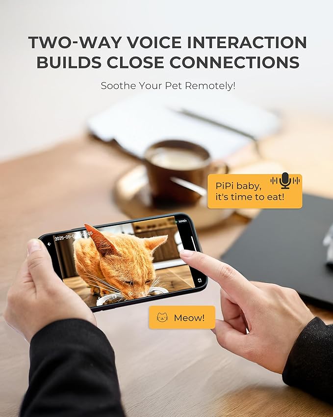- TWO-WAY VOICE COMMUNICATION: Our auto cat feeder Built-in microphone and speakers for real-time communication with pets, and contact with pets when you are away from home