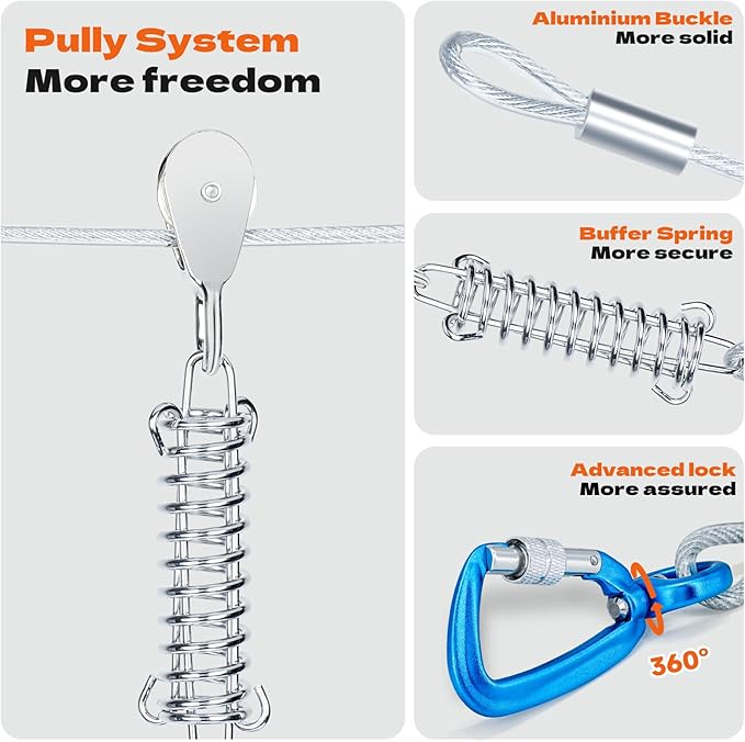 - Tangle-Free 75FT Dog Run CableSmooth-gliding pulley moves effortlessly along thick 5mm steel cable (vinyL-coated for weather resistance),creating a 3,000+sq.ft safe zone-3Xlarger than standard dog stakes for outside