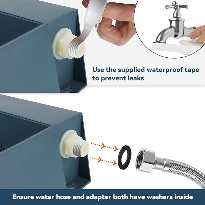 - Install Steps: (1) Install the adapter to 3/4” GHT faucet, and use the supplied waterproof tape to seal the faucet interface and prevent leaks. (2) Connect one end of water hose to the adapter. (3) Connect another end of water hose to bowl the water inlet of the automatic water bowl. Please don’t use any hose other.