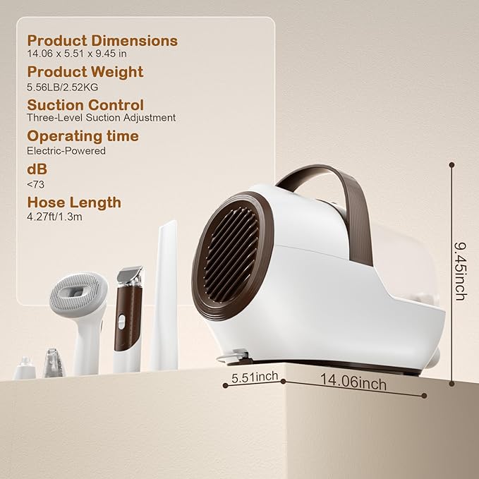 - 🐈Quiet & Stress-Free Grooming: Our pet grooming vacuum for dogs features a low-noise design to keep your pet calm and comfortable during grooming. With 3 adjustable suction levels, your dog will feel relaxed and not scared, even at the highest setting, where noise is below 73dB. This makes it the perfect dog hair trimmer for pets who are sensitive to loud sounds.