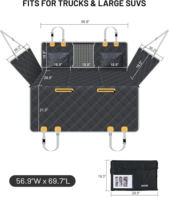 - Extended Activity Space: Our car hammock (56.9”W x 29.5”D) prevents footwell sliding, expands space by 40%, and ensures safety for movement and stretching to ease travel anxiety. Offers full rear-seat coverage, ideal for large breeds, older dogs, or multi-dog households.