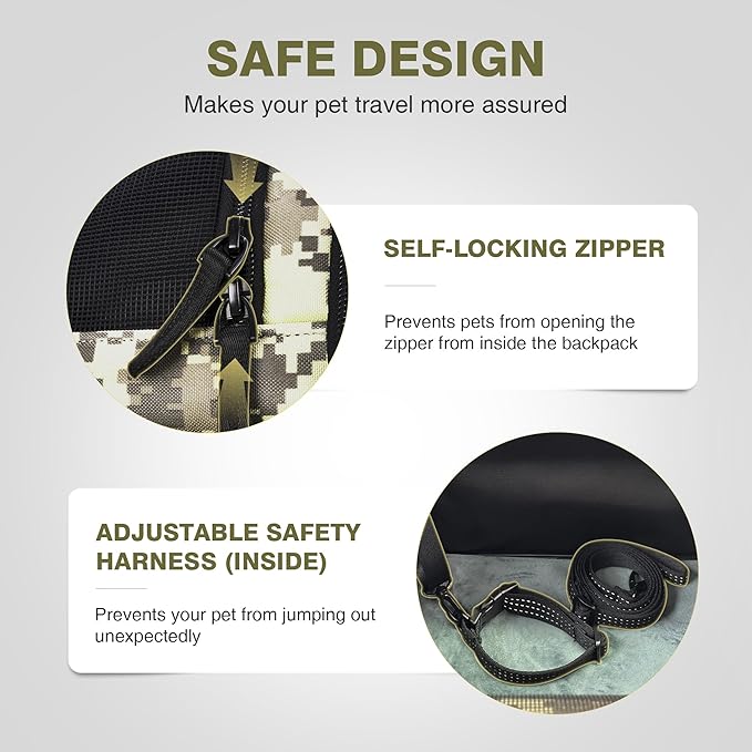 - PRACTICALITY & SAFETY: The pet backpack has three openings for pets to enter and exit easily. The left side window and front window can be opened for easy interaction with pets. The removable, easy-to-clean soft cushion provides a more comfortable activity space for your pet. The cat travel backpack is equipped with an adjustable safety belt and collar to secure the pet inside the dog backpack. The cat back pack uses a self-locking zipper, which the pet cannot open from the inside.