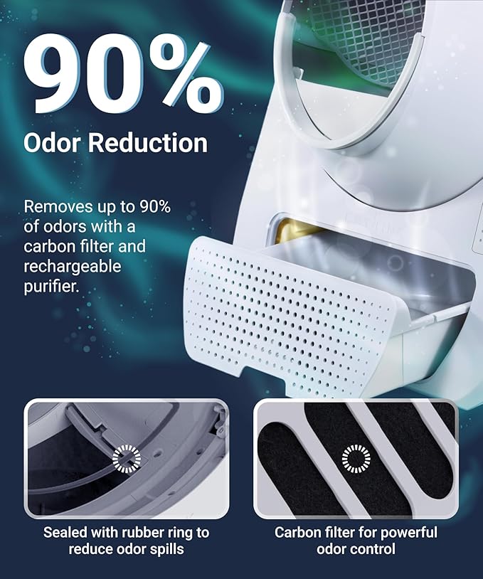 - Advanced Odor Control – Minimizes Unpleasant Smells:Our self cleaning cat litter box features a dual filtration system to help neutralize strong odors, including common litter box smells. The raised entrance includes a litter-trapping design to help reduce tracking around your home