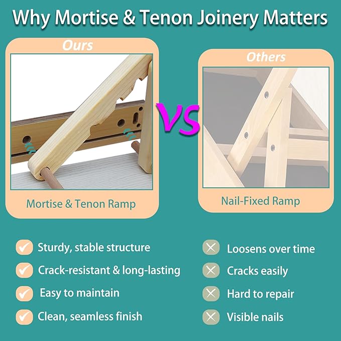 - 【Superior Grip & Anti-Slip Features】With a high-traction carpet and a rubberized surface, the wooden ramps ensures your pet won’t slip while climbing. The anti-slip rubber feet of the bed ramp for dogs prevent sliding, making it safe for use on hardwood floors and carpets without causing damage.