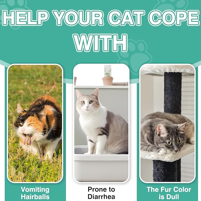 - Scientifically Formulated, Safe and Effective: Cat furball treatment is made with safe and reliable ingredients such as apple pomace, zinc proteinate and psyllium husk. Each tablet of cat hairball treats is precisely measured to ensure the safety and health of your cat. Simply feed cat hairball control scientifically according to your cat's weight. Cat hairball relief does not require the use of any laxatives or mineral oils. Hairball treats does not contain corn, wheat or artificial colors