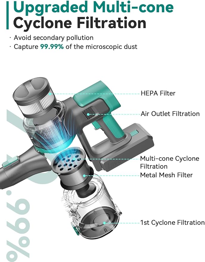 - 【Upgraded Multi-cone Cyclone Filtration System】- With 5-stage multi-cone cyclone filtration, the cordless vacuum cleaner could easily capture 99.99% of ultra-fine particles(size < 0.1 μm). The top HEPA cover and no-sponge-filter design save a lot of time on cleaning filters. You don't need to replace the filters frequently. Thus, it effectively makes the exhaust air cleaner, prevents secondary air pollution and brings cleaner air to the family