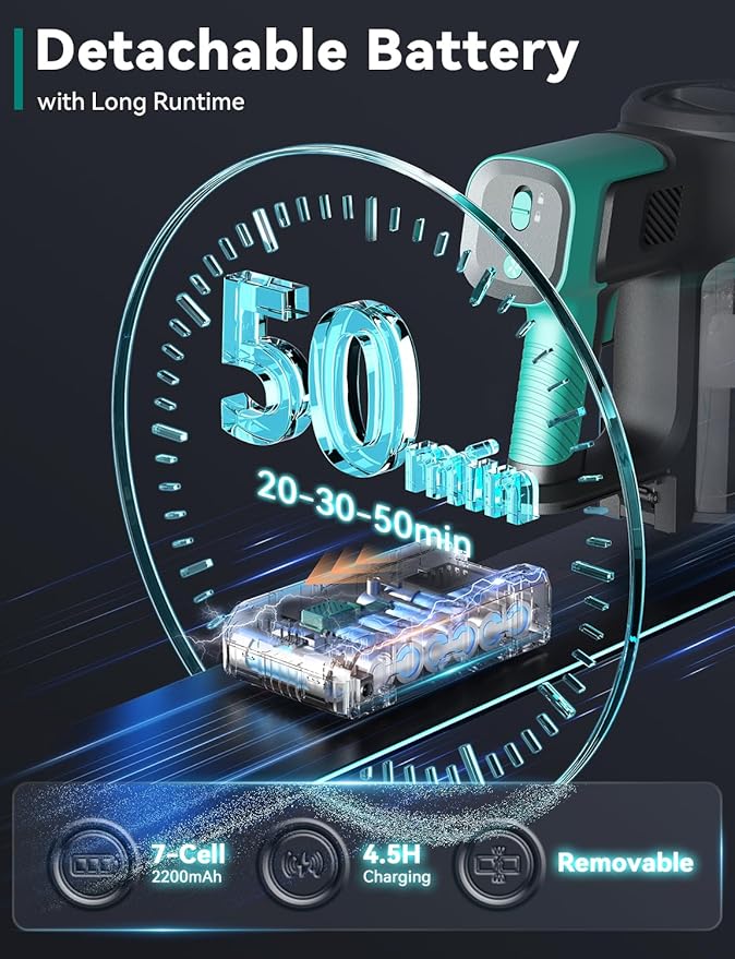 - 【Detachable Rechargeable Battery & 50mins Long Runtime】- Our cordless vacuum cleaner adopts a 2200mAh 7-cell large rechargeable battery, provides up to 50 minutes runtime in min suction mode. The battery detachable design makes it easy to be recharge separately. Item comes with a wall mount which can hold the stick vacuum cleaner to charge