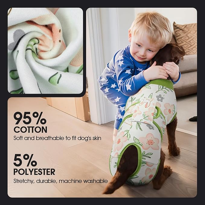 - [BREATHABLE FABRIC]: Our dog recovery suit is made of 95% cotton and 5% spandex. The recovery shirt is highly elastic and breathable, allowing the dog to feel comfortable and move freely after wearing it. No deformation after machine wash.