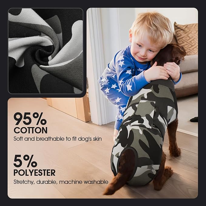 - [BREATHABLE FABRIC]: Our dog recovery suit is made of 95% cotton and 5% spandex. The recovery shirt is highly elastic and breathable, allowing the dog to feel comfortable and move freely after wearing it. No deformation after machine wash.