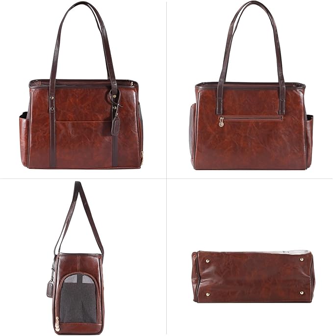 Fashion Dog Carrier Purse, Premium Leather Cat Carrier Bag, Airline Approved Soft Sided Pet Travel Tote Bag with Pockets Coffee