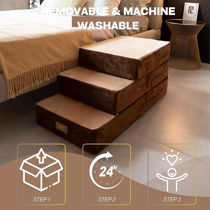 All-in-One Adjustable Dog Stairs – 5-Step Premium Pet Ramp for Small to Large Dogs – Sturdy, Non-Slip & Versatile for Beds, Sofas & More - Soft Cover, Modern Design (Brown)