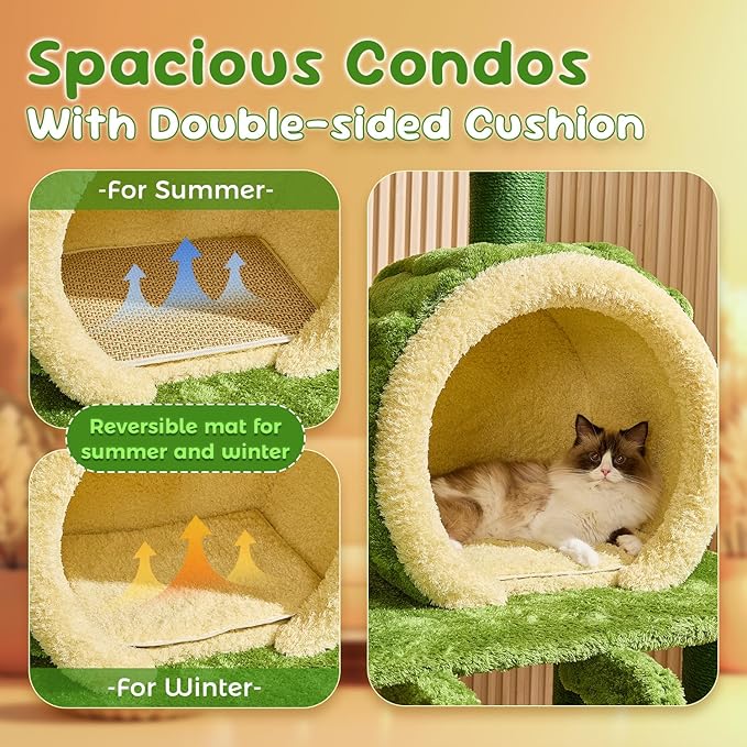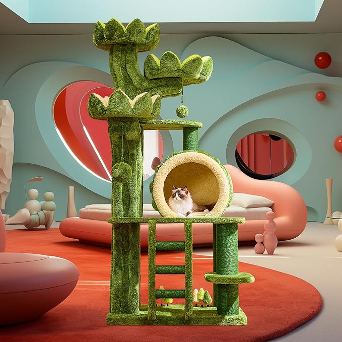 - 【Ideal for Multi-cat Families】The cat tree is an ideal choice for multi-pet households, accommodating 4-7 cats to rest or play together. It features 2 hidden cat food cave, 3 lotus perches, multiple play platforms, funny toy balls and large cat condo with double sided mat, providing ample space for your pets to enjoy climbing.