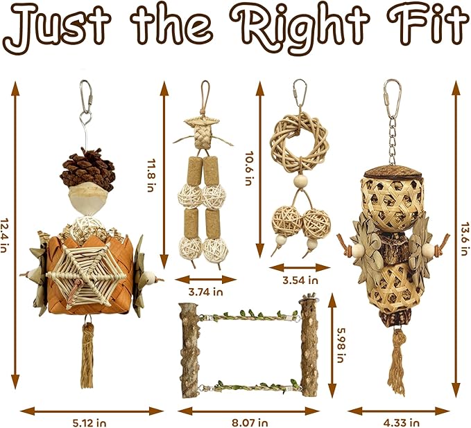- Natural and Safe Materials: Crafted from non-toxic, natural materials like bamboo weaving, flower pepper wood, rattan balls, corn husks, and wood beads, providing a safe and enriching experience for your feathered friends. Perfect for parrot toys, cockatiel toys, and conure toys.