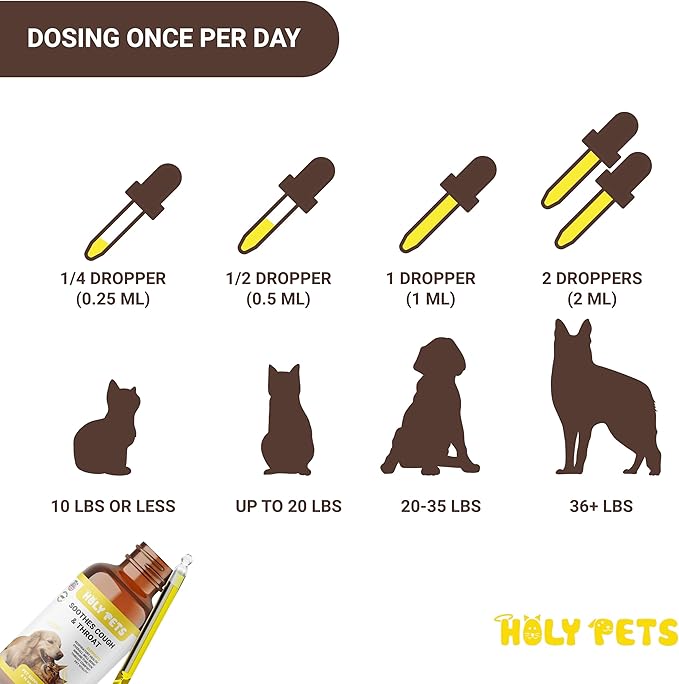 - SIMPLE AND CONVENIENT DOSAGE: Just add to your petโs food or water once or twice daily. For small pets (up to 20 lbs), use ยฝ drop; for pets between 20-35 lbs, use 1 drop; for larger pets (36 lbs and up), use 2 drops. The liquid formula is tasteless, free of chemicals, and easy to administer, making it a great alternative to pills, syrups, or chewables