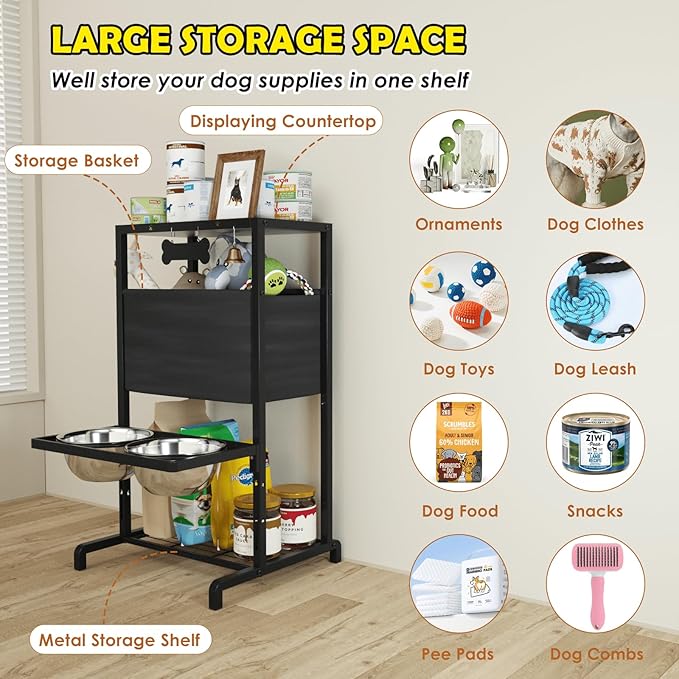 - 【HIGH RACK DOG BOWL WITH BUILT-IN STORAGE】 This innovative dog bowl stand combines a feeding station, countertop, storage shelf and toy box in one convenient unit. It provides ample space to store your dog's supplies, food, snacks, toys, etc. in an organized manner.