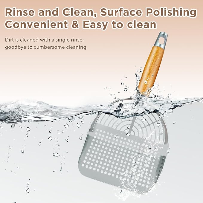 - 5-Second Non-Stick Cleanup β Stainless steel litter scoopβs polished surface prevents litter from clogging, repelling even sticky mud. Rinse without scrubbing and store via holder or hookβno residue after cat poop scooping!