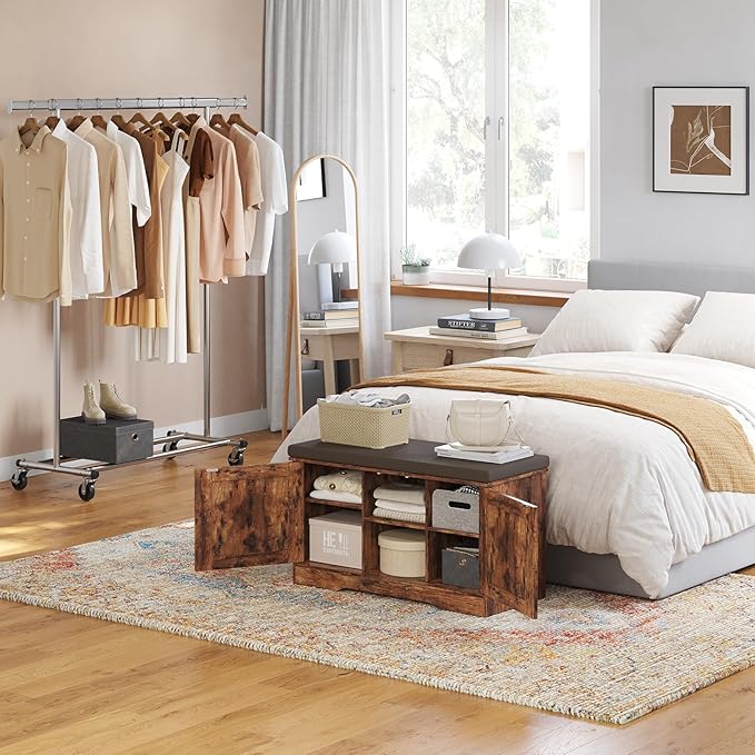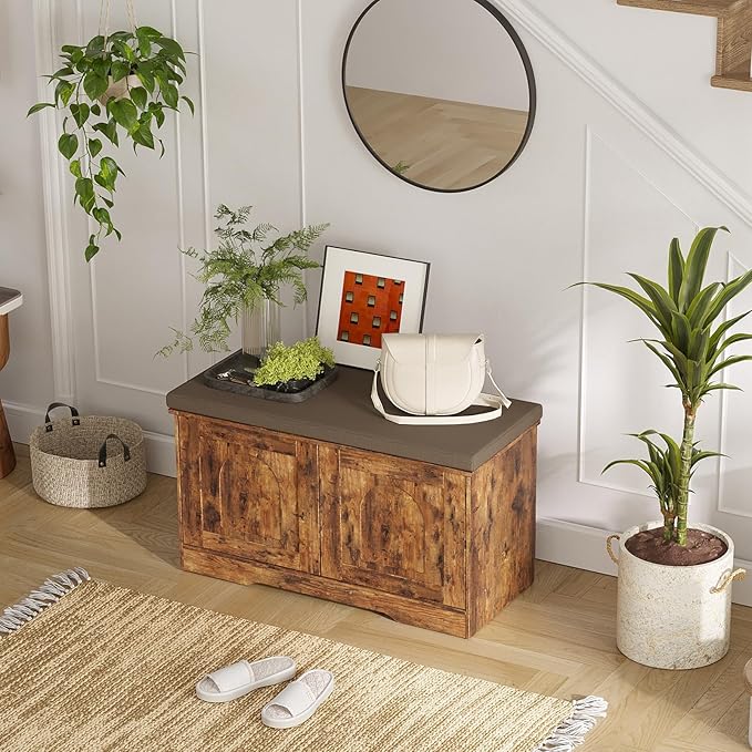 DINZI LVJ Shoe Bench, Entryway Storage Bench with Doors, Cushion, 2-Tier Shoe Rack with 6-Cubby, 31.5”L x 13.8”W Shoe Organizer Cabinet, Adjustable Shelf, Living Room, Bedroom, Rustic Brown