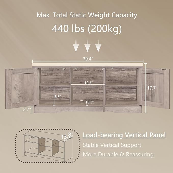 DINZI LVJ Shoe Bench, Entryway Storage Bench with Doors, Cushion, 2-Tier Shoe Rack with 6-Cubby, 39.4”L x 13.8”W Shoe Organizer Cabinet, Adjustable Shelf, Living Room, Bedroom, Greige
