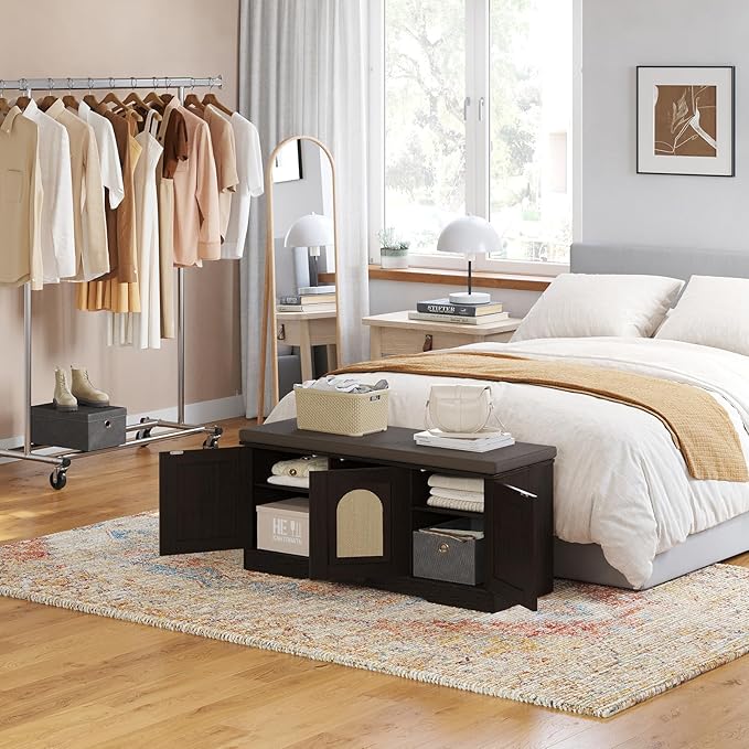 DINZI LVJ Shoe Bench, Entryway Storage Bench with Doors, Cushion, 2-Tier Shoe Rack with 6-Cubby, 39.4”L x 13.8”W Shoe Organizer Cabinet, Adjustable Shelf, Living Room, Bedroom, Espresso with Rattan