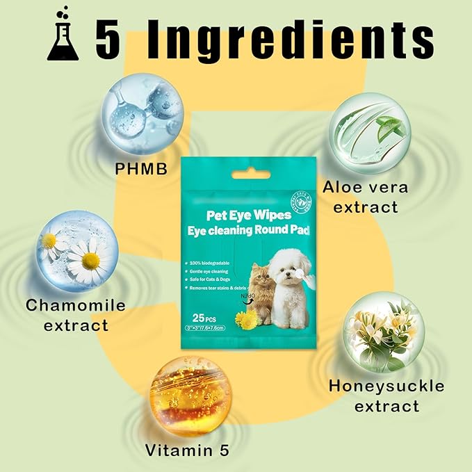 - Hypoallergenic & Naturally Soothingβ - Our pet eye wipes are infused with aloe vera, chamomile, and honeysuckle extracts to effectively combat eye irritation, remove tear stains and crusts, while neutralizing odors. Free from alcohol, dyes, and harsh chemicals, these gentle wipes are safe for all dogs' delicate eye and facial areas.