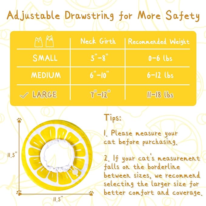 • 【SUITABLE FOR ALL SIZE OF CATS】 Soft cone for cats has an adjustable inner, so you can make a comfortable fit for your cat. By adjusting the stretchy string, cat won’t slip out of it that easily. Available in three sizes. Size L (11.5"×11.5") suitable for cats with a neck circumference of 7-12 inches (11-18 pounds cats recommended).