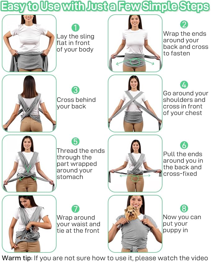 - Easy to wear: Dog carrier sling is accommodate people of different heights and body type. Pets up to 20 pounds are perfectly placed in the pet carrier sling. Detailed usage methods can refer to pictures or videos, package with specific introductions