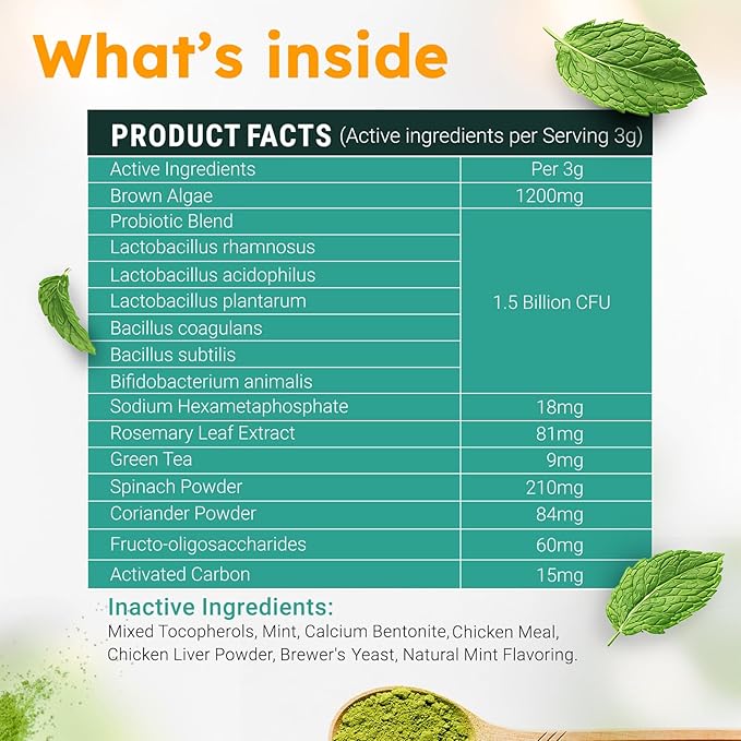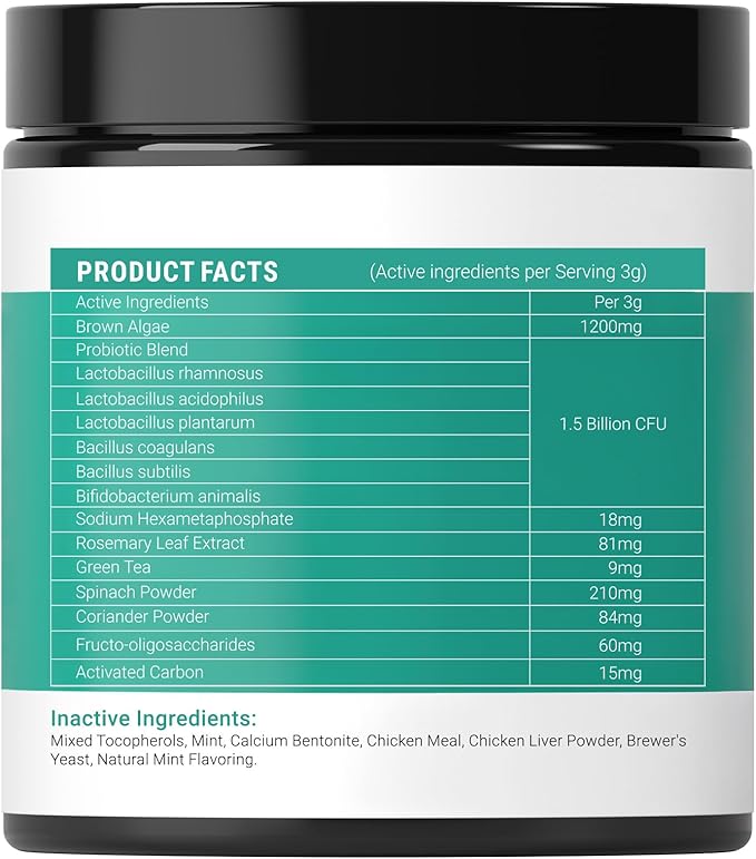 - 🦷Advanced Oral Care Formula: Our dog teeth cleaning powder features a unique blend, including powerful natural ingredients - Brown Algae, Spinach Powder, Green Tea, Rosemary Leaf Extract, Activated Charcoal, Parsley & Mint proven to reduce the accumulation of dental film and tartar buildup from the inside out for fresher breath and healthier gums.