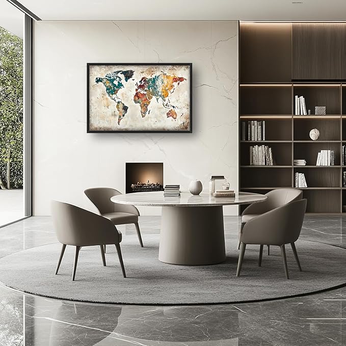 - 【Unique Design】 A vintage world map with distressed textures and colorful watercolor accents, evoking the spirit of global exploration. A soft oil painting on canvas, with neutral tones.