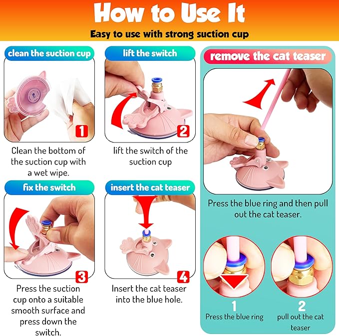 - Upgraded Super Suction Cup Wand:Equipped with a larger and stronger suction cup that sticks firmly to smooth surfaces (floors, glass, tiles). It comes with 3 cat-approved replacement heads: vibrant feather, fluffy caterpillar, and colorful pompom balls—offering varied play styles for endless fishing fun.