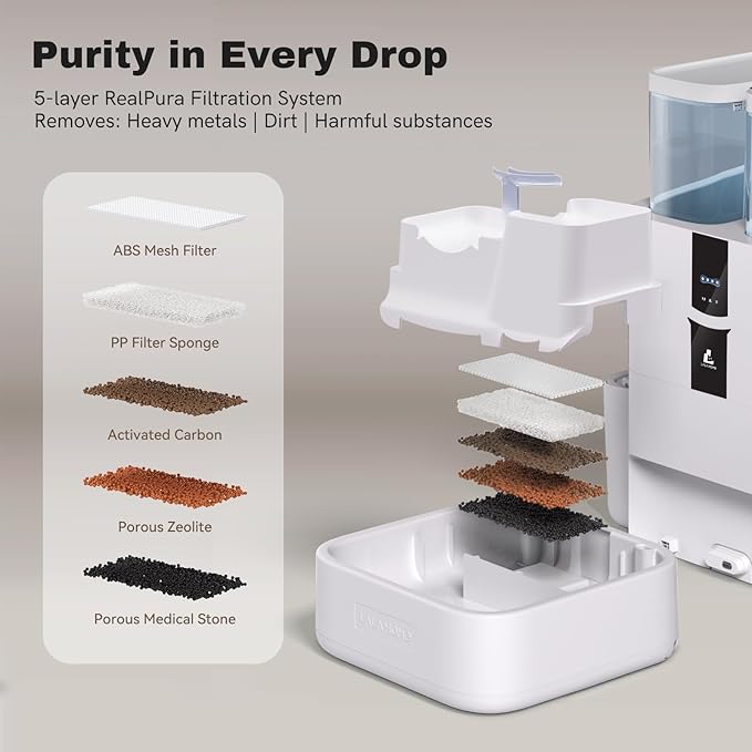 - Cleaner Water with the Unique 5-Stage Filtration: LALAHOME cat drinking fountain stands out with 5-stage filtration system: Water gets pre-filtered through a mesh screen, trapping hair and gunk in a sponge filter. Then itβs pushed through activated carbon, zeolite, and finally cleaned by the maifan stone. It can effectively filter and diminish the hair, impurity, odor, and chlorine. The filtered water dispenser can give cleaner water to pets and reduce the risk of developing illness.