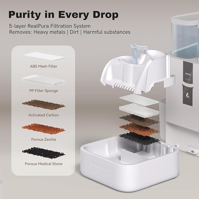 - Cleaner Water with the Unique 5-Stage Filtration: LALAHOME cat drinking fountain stands out with 5-stage filtration system: Water gets pre-filtered through a mesh screen, trapping hair and gunk in a sponge filter. Then itβs pushed through activated carbon, zeolite, and finally cleaned by the maifan stone. It can effectively filter and diminish the hair, impurity, odor, and chlorine. The filtered water dispenser can give cleaner water to pets and reduce the risk of developing illness.